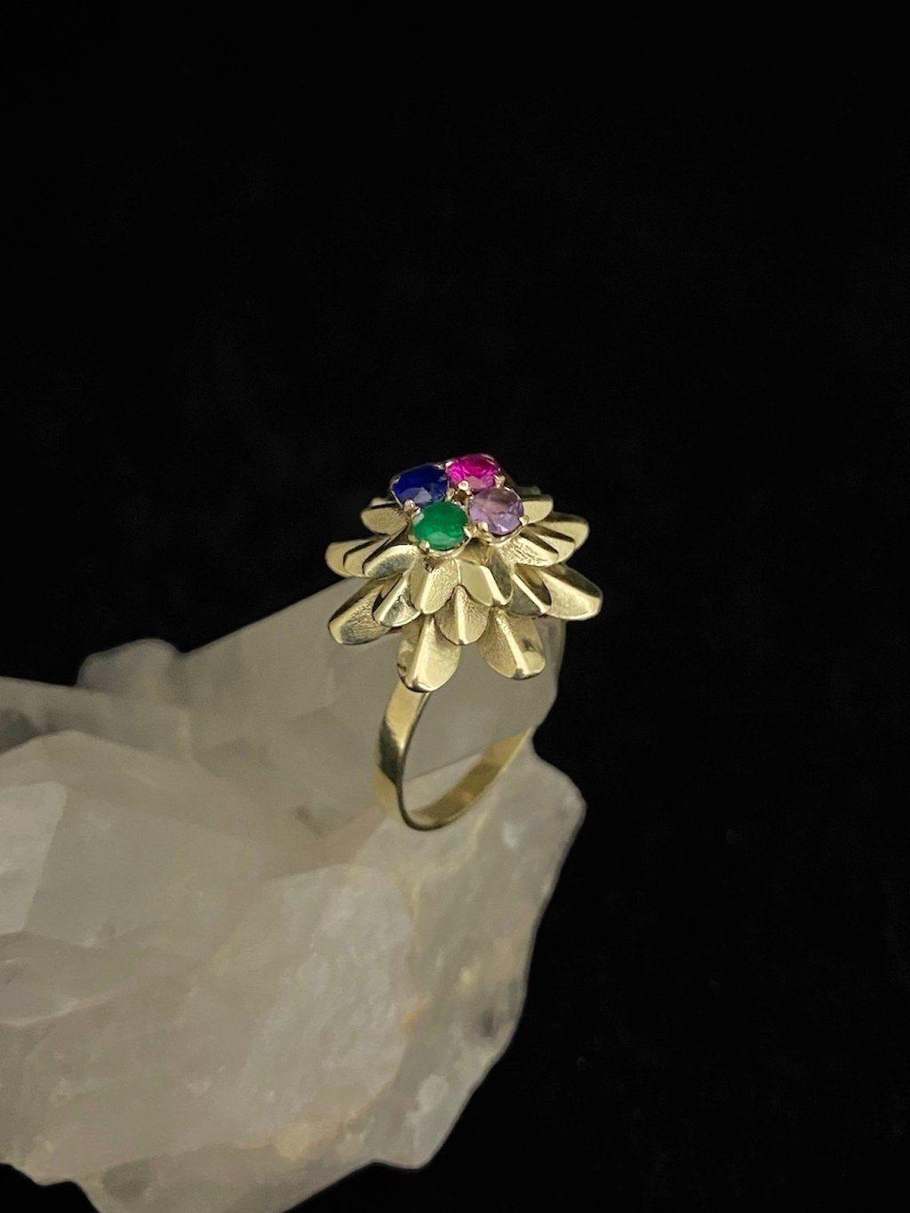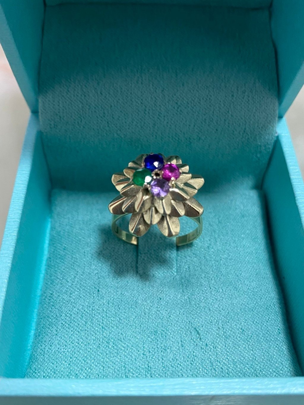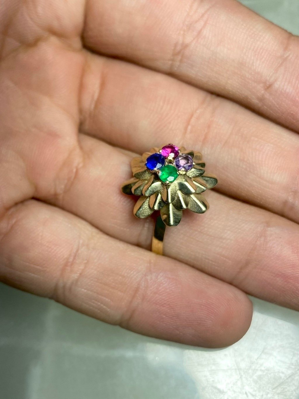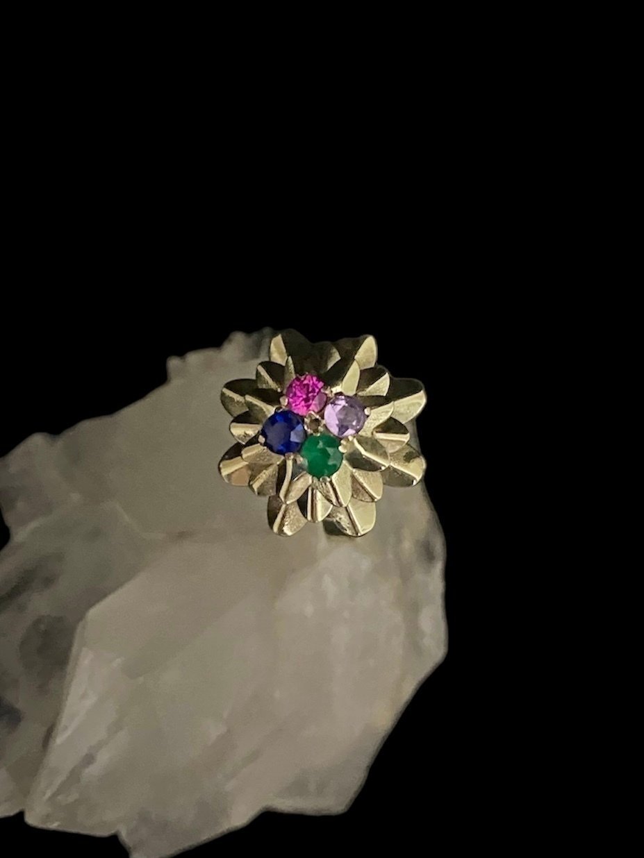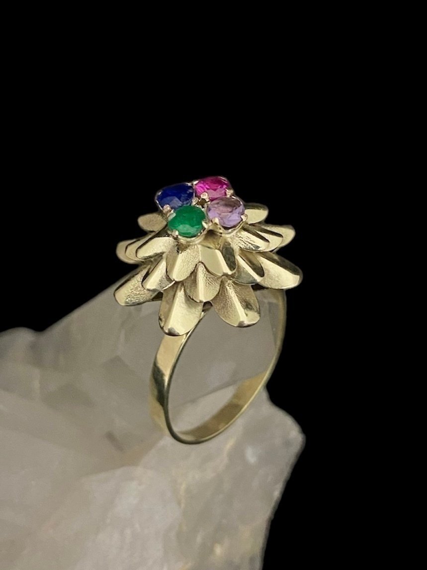 •Anel Ouro Modelo Flor Africana -Material: Ouro 18k, Esmeralda, Safira, Ametista e Turmalina Rosa, pedras naturais e preciosas com 10 pontos cada; -Dimensões aproximadas: 3cmx3xmx1cm -Numeração: Fabricamos em qualquer númeração, especificar no ato da compra. -Gramatura aproximada: 2.7g •Pagamento: -Aceitamos pagamento parcelado até em 10x sem juros, em todos os cratões de débito e pix. •Fábrica: -A M.Adriane tem fabricação em Goiânia-Goiás e duas joalherias, uma junto á fábrica na rua 250, número 58 setor Coimbra e uma no Araguaia Shopping. Fábricamos qualquer peça em Prata ou Ouro sob encomenda pelo instagram ou whatzapp +55 (62)98147-4759 •Garantia: -Todas as peças M.Adriane em Prata 925 e Ouro 18 possuem garantia vitlícia. Nosso contato para orçamentos no atacado ou dúvidas é o whatzapp +55(62)98147-4759